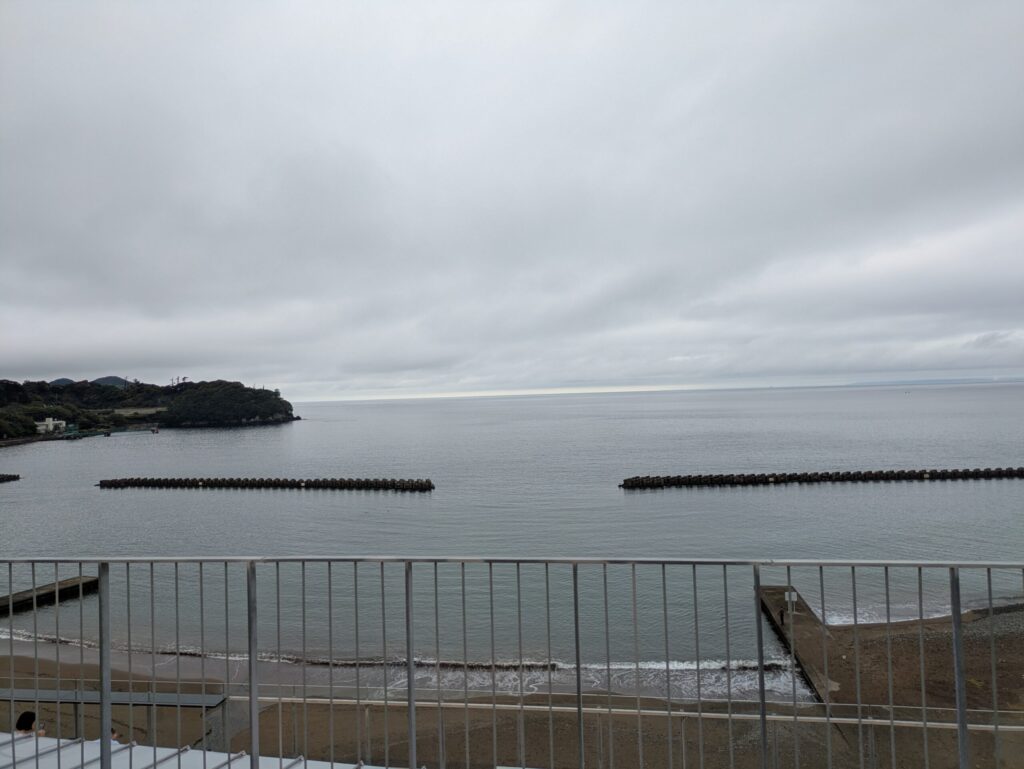 周辺の建物と比べて、高い施設になりますので、海が良く見えましたが、この日は生憎の曇りでした。