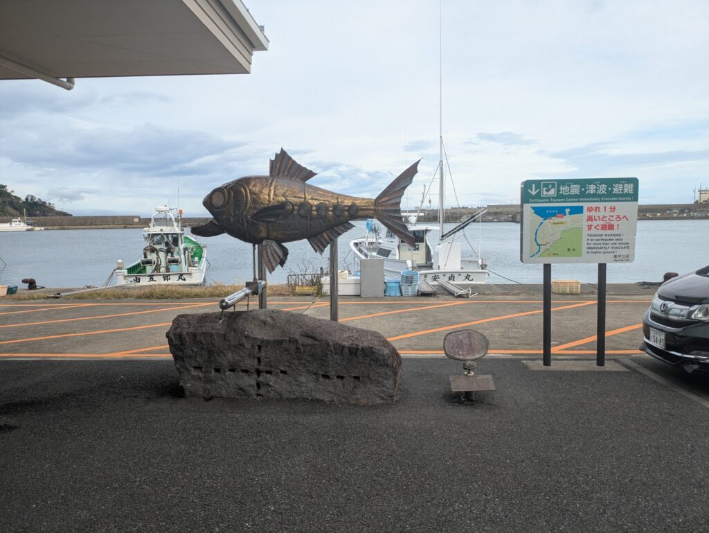 建物近くには金目鯛のオブジェクトがあり、何組かがオブジェクトの前で写真を撮っていました。